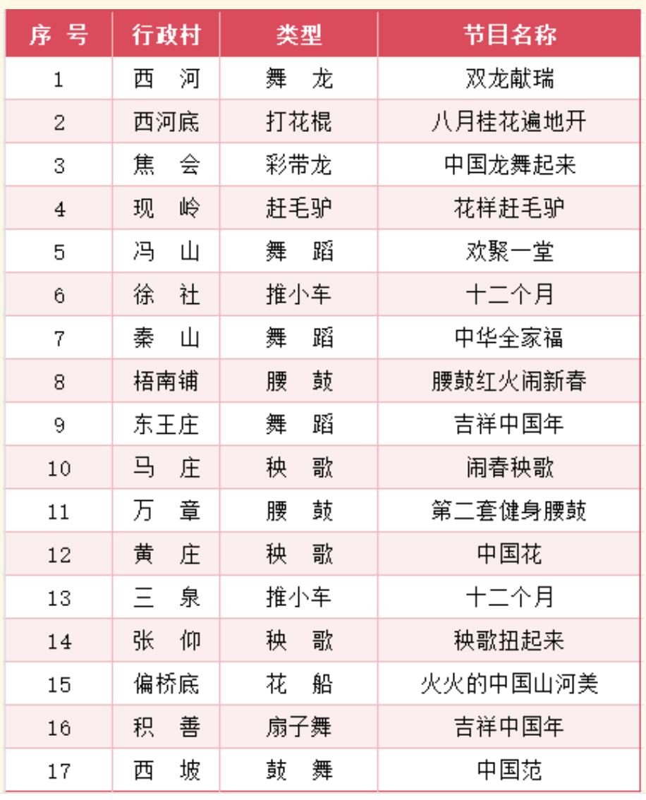 游行路线:西河底村电管站-八角楼-信用社-镇政府(场地表演)-中学操场(主场地)