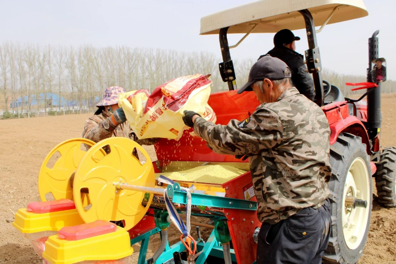 不远处,地头传来清脆的笑闹声。崔树芳和姐妹们扛着种子袋往播种机里添料,她利索地扯开袋口,金灿灿的玉米种顺着布袋“哗啦啦”地涌进播种仓。