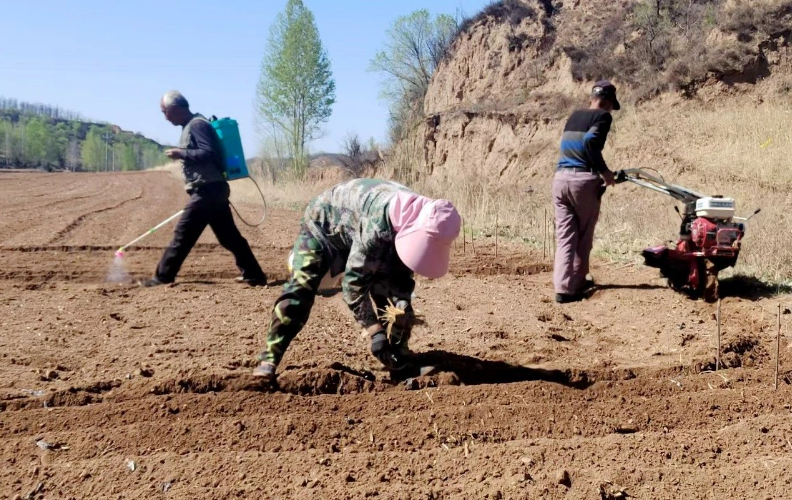 走进圪咀头村党参种植基地,播种机在田间来回穿梭,与务工村民们默契配合,翻土、开沟、放苗、喷洒农药、覆土等一系列种植作业正在紧张而有序地进行,现场呈现出一片热火朝天的劳动画面。