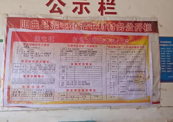 山西新闻网三农频道讯 为进一步加强党内监督、拓宽民主监督渠道,保障党员群众知情权、参与权和监督权,7月15日,阳曲县泥屯镇按照县委、县政府要求,全面开展党务村务公开工作。 对党支部组织分工情况、“主题党日活动”开展情况、“四议两公开”工作决议情况、村级收入公开明细表、村级支出公开明细表等信息张榜公示,方便党员群众知晓。