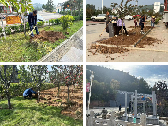 大端新区绿化美化工程 对大端新区周围进行绿化提升,组织村民在闲置空地铺设花圃草坪、种植树木、修葺凉亭改善环境状况,提升村民生活品质。