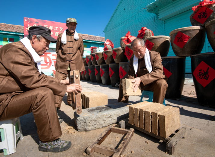 醋曲是制作醋的必备原料,制曲则是做醋的第一道工序。先将高粱、大麦、豌豆、玉米等杂粮,经过磨粉后掺适量清水搅拌均匀而加压制成砖状形,接下来便是“踩曲”:就是通过脚踩的方式将这些砖状的醋曲踩成结实的大曲块,整个过程踏歌而起,热闹非凡。