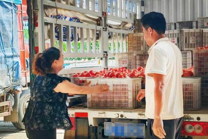 园区里,前来收购西红柿的货车络绎不绝。河北邢台客商柴永超说:“这里的西红柿皮薄、肉厚、多汁、酸甜可口,就是我们小时候吃的那种原汁原味的西红柿味道!客户的反馈特别好,回头客特别多。”