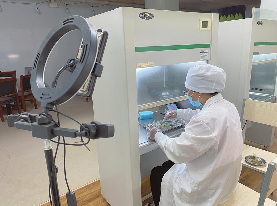阳城县町店镇红薯种植科技产业园直播基地里,技术员正在进行红薯苗脱毒速繁直播。 图为“高山小米可视化溯源基地”里的太阳能农业小型气象站。