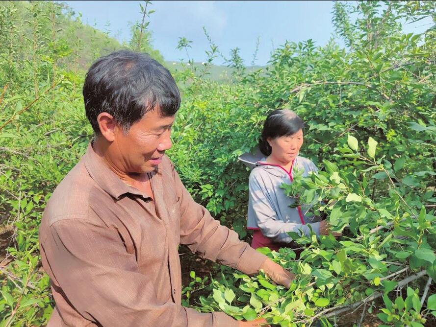 南北坡村村民正在自家地里采摘连翘果。宋榜娟 摄 南梁镇万亩连翘园区。