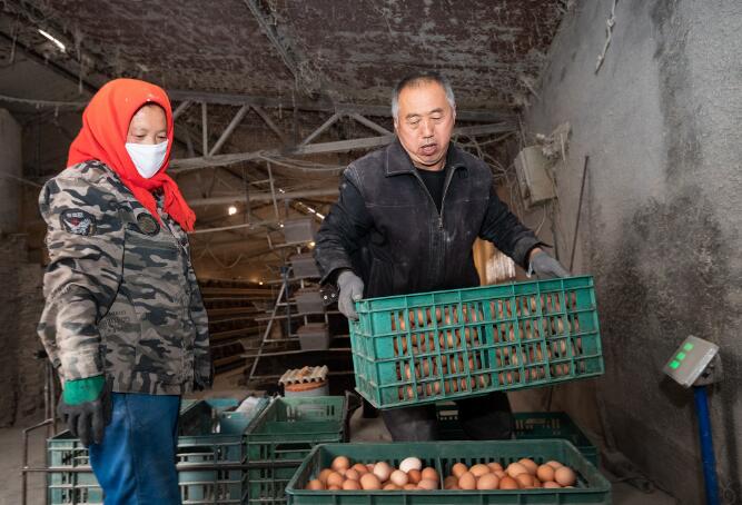 山西新闻网三农频道讯 1月8日,左权县东寨村李献林夫妇正在自家的养鸡场捡鸡蛋。今年57岁的退伍老兵李献林,2005年开始养鸡,从最初的1000余只扩大到现在年存栏1.8万只的规模,成为当地有名的养鸡专业户,年收入达到10多万元,靠科学养殖走上了小康之路。