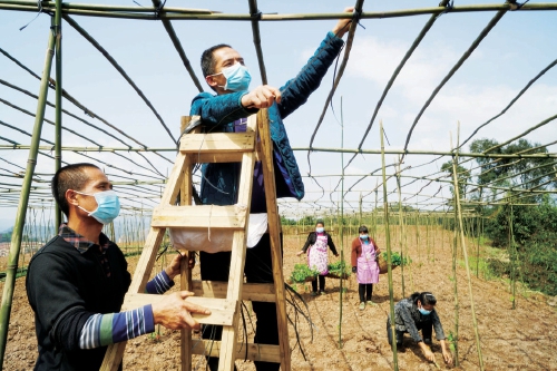 随着疫情防控趋于稳定,贵州省赤水市组织驻村党员干部联合农技辅导员深入扶贫种养殖项目基地,带领群众有序复工复产,助力脱贫攻坚大决战。图为近日,该市文华街道党员干部到双龙社区帮助果农搭建百香果树支架。