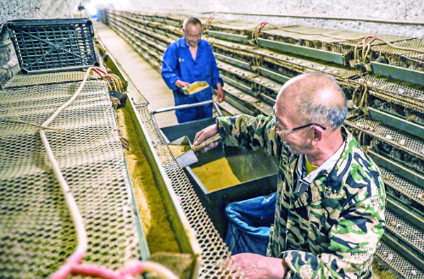 5月11日,芮城县陌南镇刘堡村勇源养殖场员工在为鹌鹑投食。 该养殖场将当地闲置窑洞改造后进行鹌鹑养殖,采用“公司+农户”的模式,带动20余人就业。