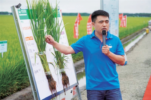 中化农业有关技术人员在现场讲解水稻侧深施肥效果。 “现在正是灌浆期,再有1个多月就能收获了,照目前情况看,亩产1200斤没啥问题。