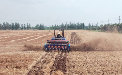 黄淮海夏大豆麦茬免耕覆秸精量播种现场。 吴存祥 摄 8月21日,在中国农业科学院作物科学研究所东圃场试验基地,一场大豆“藏粮于技”核心技术现场观摩会正在举行。