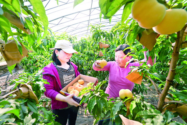 近日,永济市虞乡镇雷家庄村蔬菜大棚产业园区内,种植户在采摘蟠桃。近年来,雷家庄村大力发展西红柿和乳瓜大棚种植产业,通过“合作社+企业+农户”方式,进一步增加村级集体经济收入。