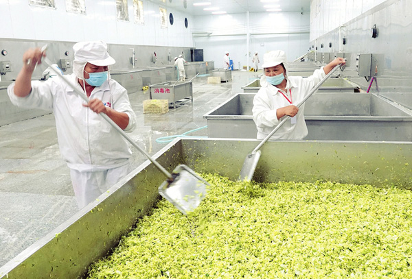 8月4日,在大同市天镇县博诚蔬菜有限责任公司脱水蔬菜烘干车间,工人们正在加工即将出口的脱水蔬菜。近年来,该公司带动一千余户贫困户参与三万余亩蔬菜基地建设,农民增收三百五十万元,完成出口总额三千余万元,走出了一条企业发展和农民脱贫的双促共赢之路。