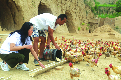 图为驻村第一书记臧南南与合作社人员饲养“飞鸡”。 陈平 摄 近日,省委驻临县林家坪镇杨家山“飞鸡场”,产出高质量的“飞鸡蛋”。