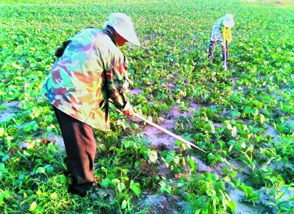 8月10日,河曲县旧县镇杨家窊村农民正在豆田里锄草。近期,该县境内雨水较多,田间杂草长势旺盛,农民们早出晚归加大锄草力度,确保种植效益。