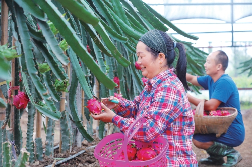 近日,河南省信阳市光山县紫水街道办事处前楼村农民梅贤宝和妻子刘恩芳在收获火龙果。夫妻俩于2017年返乡创业,开办贤宝家庭火龙果种植农场,并从台湾引进软枝大红火龙果苗及种植技术,亩均收入可达3.5万元。
