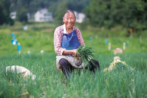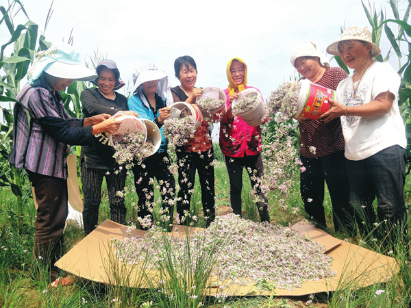 8月8日,晋中市太谷区小白乡上庄村几名妇女正在采收佘韭花。2018年以来,太谷青年陈文林在山西农业大学联合创业基地种植佘韭花,目前10余亩佘韭花亩产达到100公斤。