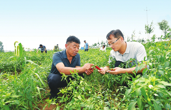 8月18日,长治市屯留区路村乡党委副书记李旭和老军庄村委主任刘振生,正在地里研究探讨被冰雹袭击后如何对尖椒进行科学养护。该乡充分利用区位优势,强力推进以“万亩辣椒基地”为重点的种植业结构调整,辣椒产业发展不断壮大,目前全区建设国家农业标准化辣椒种植示范区达6.18万亩,仅尖椒调产面积就达11350亩,农户可以在家门口打工,每户通过打工可增收2000余元。