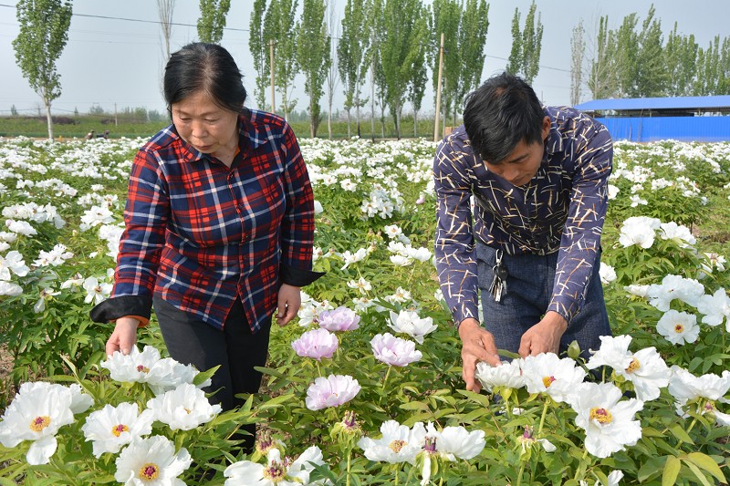 4月14日,临猗县楚侯乡小南村王安武和妻子介婵娟在观察牡丹花开情况。王安武夫妇4年前投资2万余元,从山东菏泽购买凤丹和紫斑两种牡丹苗木,将自家15亩耕地全部变成牡丹园。