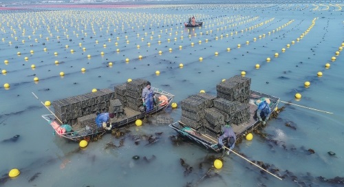 4月26日,在山东荣成俚岛镇的鲍鱼养殖区域,养殖工人在放置鲍鱼养殖苗箱。随着荣成海区海水温度的回升,在福建省莆田、连江等地海域“越冬”的5000余万头鲍鱼将陆续回到俚岛镇。