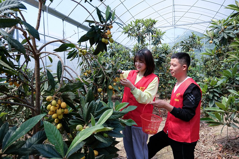 近日,浙江省长兴县林城镇农业基地的水果陆续成熟上市,当地党员志愿者积极组织帮扶小分队,帮助低收入果农采收水果,并通过“云直播”“云销售”的方式进行推销,助力果农增收。图为镇上狮村的枇杷种植基地内,青年志愿者在帮助果农采摘枇杷。
