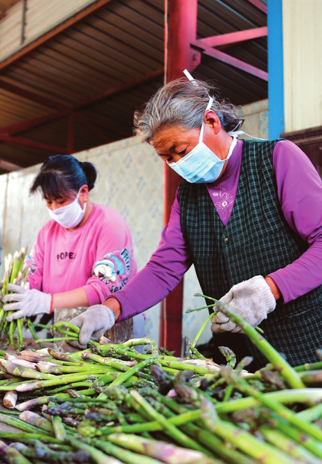4月29日,在孝义市仁义村芦笋种植专业合作社内,村民正在加工刚刚采摘的新鲜芦笋。从2015年开始,该村成立专业合作社规模化种植芦笋,2019年合作社又新增了两个种植基地,年可提供就业岗位120余个,人均月增收3000元。