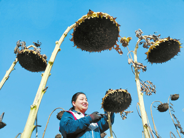 10月23日,沁水县土沃乡交口村农民正在采收葵花。金秋时节,沁水县葵花喜获丰收,当地农民抓紧晴好天气进行抢收和晾晒,力保颗粒归仓。