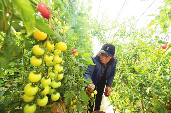 11月23日,太原市阳曲县万向农业园西红柿大棚种植基地内,工作人员正在采摘成熟的有机西红柿。据了解,该农业园致力于现代农业科技种植发展,实现了无农药、无化肥、无抗生素的绿色种植产业链,力求打造高端、智能、科技的现代农业基地,以绿色种植提品质、增效益。