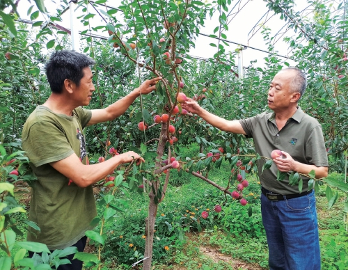 辽宁省农科院果树所所长刘威生(右)在给果农做指导。 “三月风光一岁无,杏花欲过李花初”,中国古代诗人写了很多有关风花雪月的诗句,涉及李、杏的不少,也说明李、杏很早就在我国栽培。