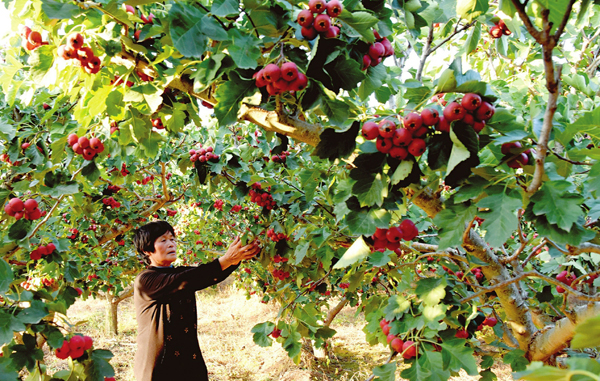 10月7日,垣曲县华峰乡丰村果农陈金争正在采摘山楂果。丰村是该县的山楂生产基地,山楂种植面积1000余亩。