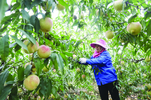 10月12日,河南省平顶山市宝丰县商酒务镇韩庄村村民在采摘富硒桃。 近年来,河南省宝丰县商酒务镇因地制宜调整农业产业结构,通过“公司+基地+农户”模式,引导农民利用丘陵荒坡发展林果种植,增加收入,助力乡村振兴。