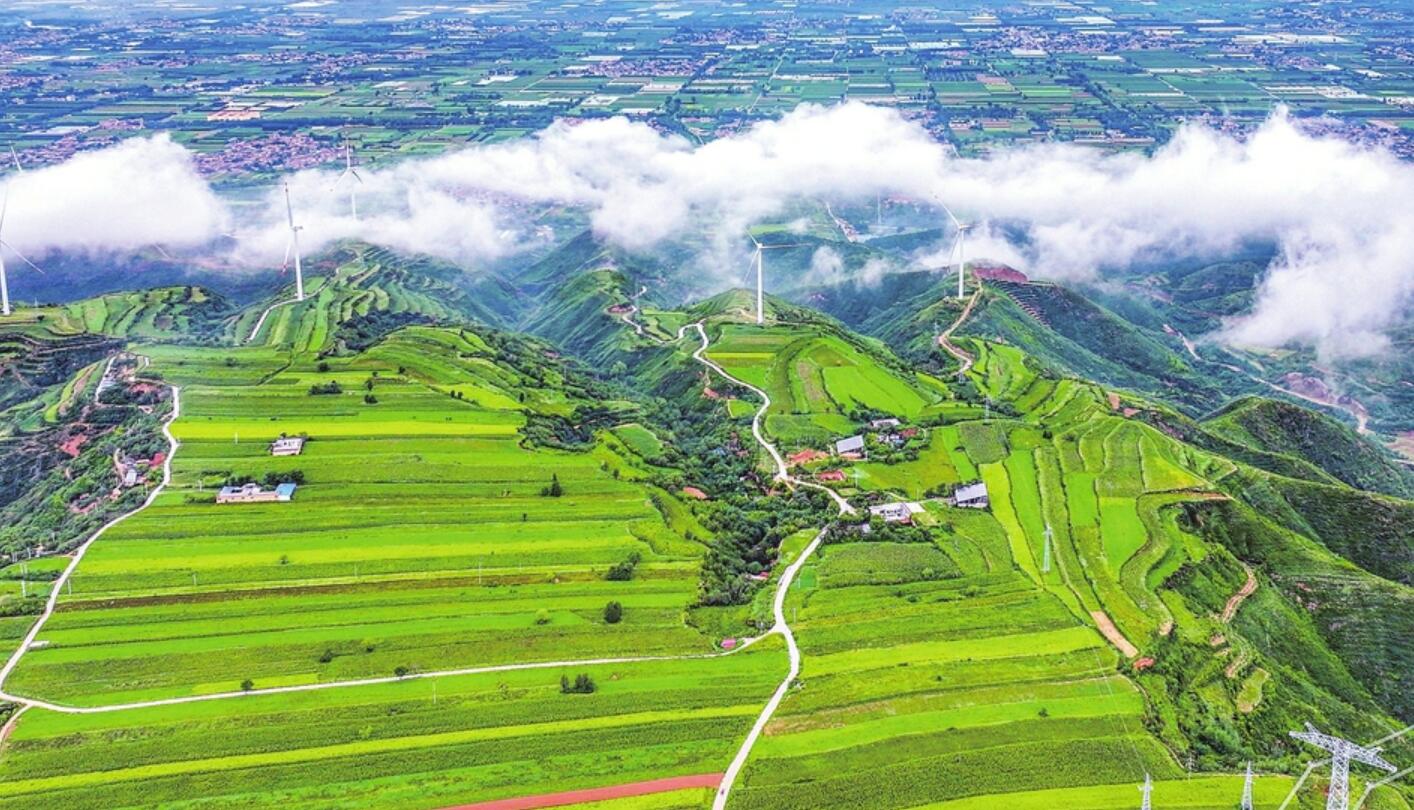 9月4日,俯瞰夏县瑶峰镇大山深处,云雾氤氲,一座座风机叶片迎风转动,层层叠叠的梯田宛如黄绿色的地毯铺展开来,民居点缀其间,构成一幅充满诗意的秋日画卷。