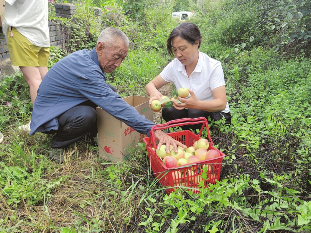 嘎啦苹果较其他品种早熟且脆甜多汁。新鲜的苹果刚刚摘下,便吸引了周边不少水果商贩前来批发。他们直接把车开到田间地头,现场交易、现场装货,省去了中间环节,也保证了苹果的新鲜度。脆生生地咬一口手中的苹果,收购商白胜利开心地说:“城关村的苹果口感确实好,又脆又甜,今天一大早我就拉走20多箱,估计下午就能卖完。”
