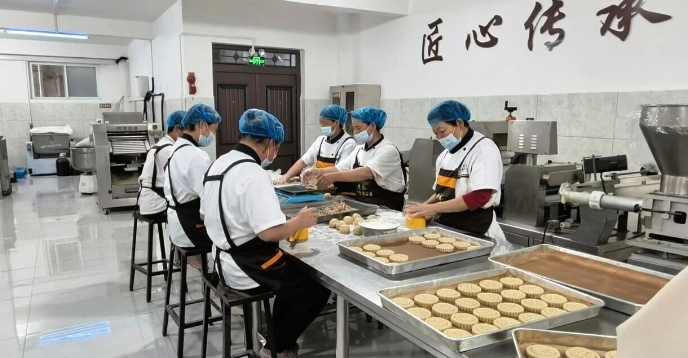 走进御香乐的生产车间,面香与馅料甜香交织,师傅们手法娴熟,揉面、包馅、压花、着色、烘烤……每道工序皆遵循古法,纯手工完成。该公司坚持以绿色无公害面粉为基底,精选冰糖、花生仁、核桃仁、玫瑰酱、黑芝麻、青红丝等天然原料,全程不添加防腐剂与人工香精,只为留存传统月饼的本真风味。