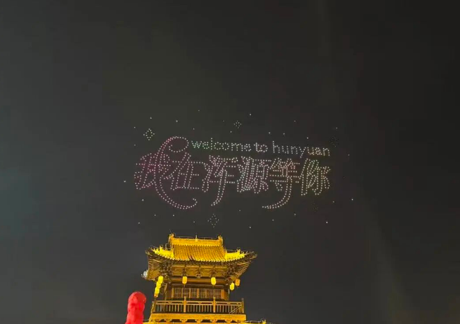 千余架无人机在浑源古城上空集结,以天为幕,以光为笔,为市民和游客呈现一场科技与人文交织的视觉盛宴。