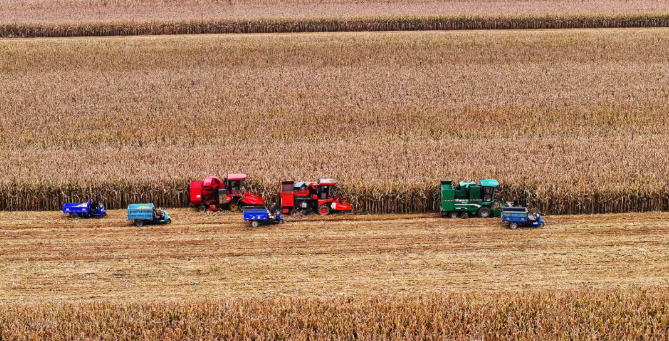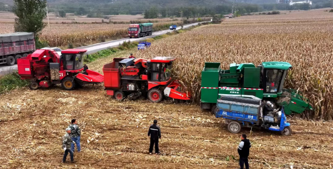 在东苌池村千亩玉米种植地,多台收割机正开足马力,硕大的收割台如钢铁巨臂般横扫过垄间,锋利的摘穗辊迅速将玉米秆卷入机腹,脱皮后的玉米穗直接装入紧随其后的农用三轮车。田间地头,收割机、三轮车来回穿梭,将满载的玉米运往集中储存晾晒区。