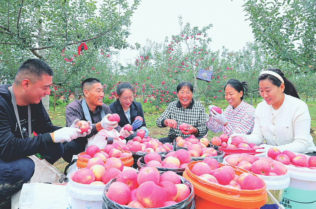 金秋时节,记者在大宁县的“宁脆”苹果园里看到,红彤彤的苹果压弯枝头,果农们挎着竹篮,手持果剪,穿梭在果树间,小心翼翼地将成熟的苹果摘下。