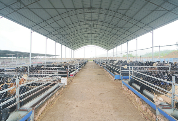 秋日,长子县大堡头镇崇仁村土门岭的50亩荒坡上,现代化羊舍与饲料厂房整齐排列,羊舍中黑山羊正悠闲进食。