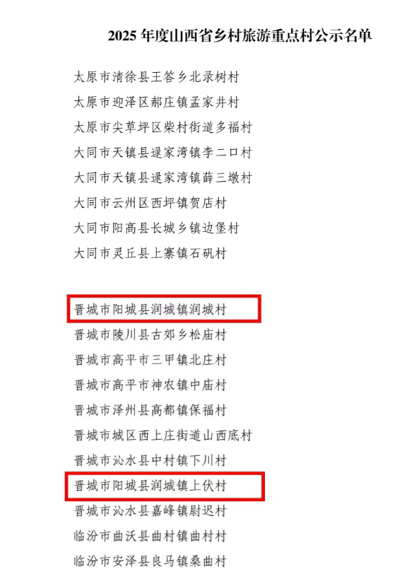 11月12日,山西省文化和旅游厅发布《2025年度山西省乡村旅游重点村镇名单公示》,其中,晋城市阳城县润城镇 润城村 、 上伏村 拟入选为全省乡村旅游重点村镇名单。