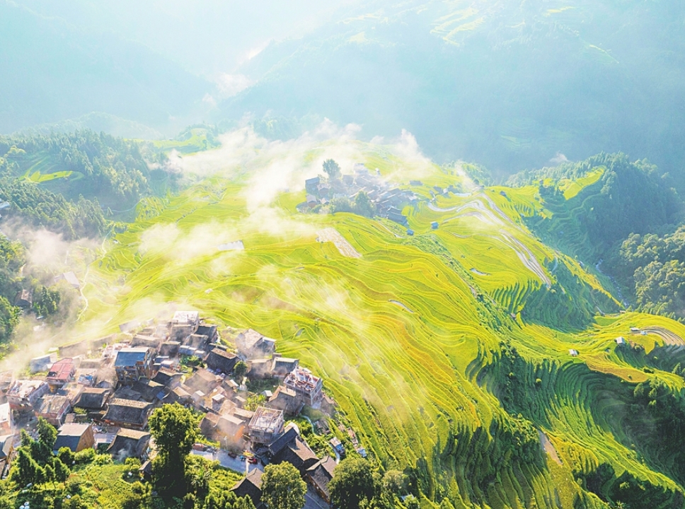 贵州省从江县加榜乡党扭村入选第三批中国传统村落,以梯田中散落着苗乡独具特色的吊脚楼著称(无人机照片,2025年8月24日摄)。 新华社发(吴德军摄)