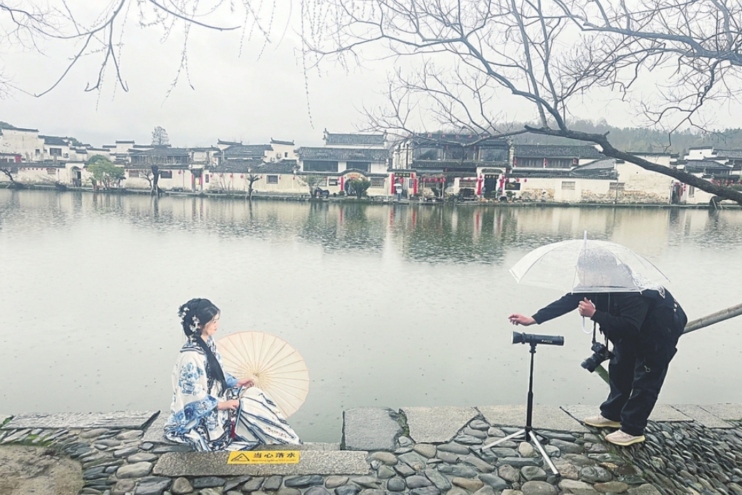 游客在安徽省黄山市黟县宏村镇宏村拍照。新华社记者刘军喜摄