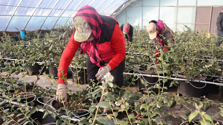 企业效益向好的同时,也带动了周边村民增收致富。如今大棚里的100多名工人,均来自周边村庄。河头乡下峪村村民马维英就是其中一员,她和老伴郭文云利用农闲时间在大棚打工,实现了家门口就业增收。“以前农闲就待在家里没收入,现在来蓝莓大棚打工,一天能挣150块钱,离家近,还能照顾家。”马维英的话语里满是满足。