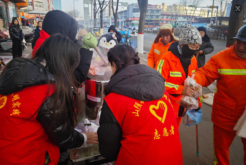在县城人流量大、户外劳动者集中的主要街道,精心设置了5个“爱心粥棚”服务点。清晨,志愿者们冒着严寒早早到位,将热气腾腾、香甜可口的腊八粥分发给环卫工人、快递小哥、外卖骑手、出租车司机、交通警察等户外劳动者和新就业群体。一碗碗暖粥,不仅驱散了冬日的寒意,更传递着社会对这些平凡岗位上默默奉献者的尊重与感谢。服务点现场秩序井然,笑语盈盈,暖意融融。