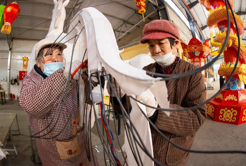 以前,村民栗会青没有花灯制作基础。在村集体组织的培训中跟着师傅系统学习,如今已能熟练完成整套工序。“既能照顾老人孩子,挣得也不少,日子越来越有奔头了。”