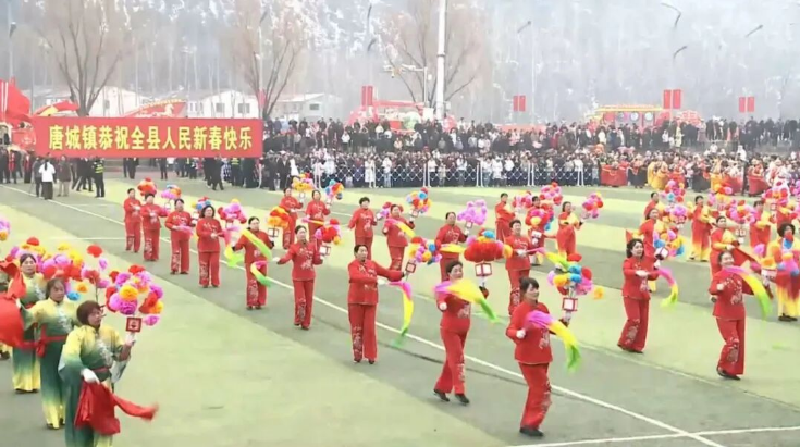 唐城镇社火表演《花灯万盏贺新岁 鼓韵千锤振雄风》中,百人威风锣鼓表演气势磅礴、鼓点铿锵,激昂的节奏响彻云霄,敲出了唐城人民昂扬向上、奋勇争先的精神风貌。随后登场的省级非遗“唐城花灯秧歌”惊艳全场,演员们手持花灯,巧妙融入唐俑舞蹈元素,糅合长绸飞舞的优美与情景表演的灵动,穿插跑马表演,在欢快的鼓点中,将传统民俗的独特魅力展现得淋漓尽致。